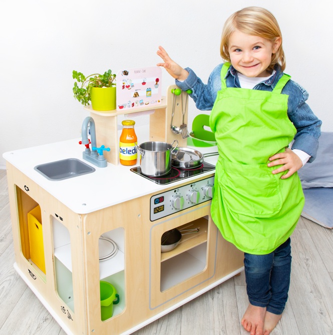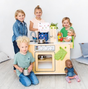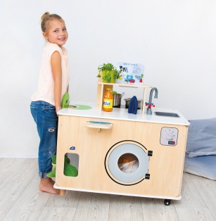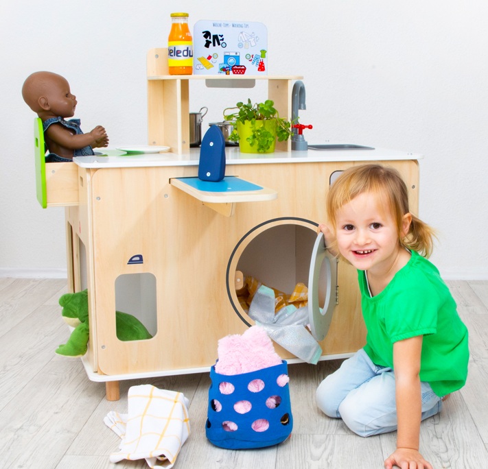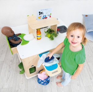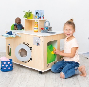 Madlavning, vask, strygning og meget mere kan klares i det nye mobile rengøringscenter! Der er noget at opdage overalt: kogehjørne med varmeplader og ovn og gode opskriftskort, udtrækkelig højstol og alt til at passe på dukken, stryge- og vaskehjørne med strygejern og udtrækkeligt strygebræt samt en vask og skraldespand til at holde orden. Her er ingen grænser for kreativiteten, og flere børn kan lege sammen!