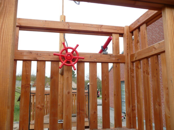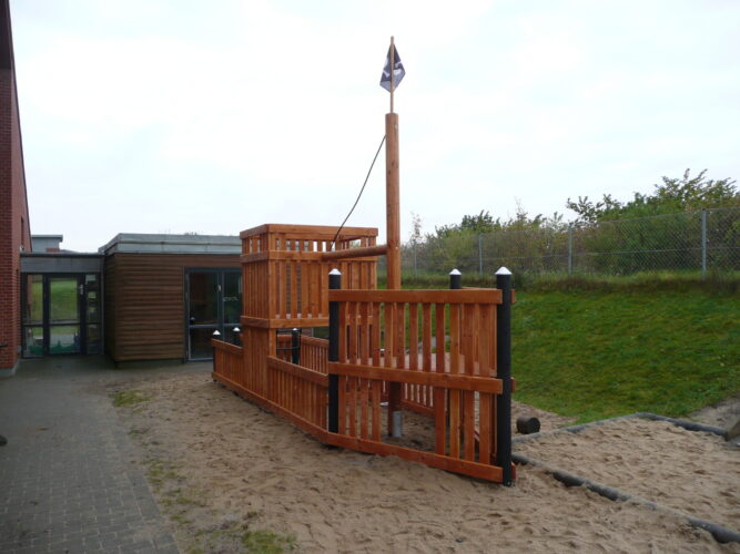 Nyt spændende skib med masser af udstyr- Opbygget i “Pine” oliebehandlet douglas bjælker og store egetræs stolper. Bådens opbygning passer godt ind i Ran-Plays øvrige legeplads produkter, med stor respekt for miljø og ægte olie behandlet træ.