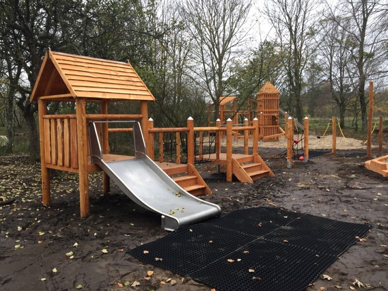 Her er et lille legetårn med trappe og rutchebane, samt 2 repos med junglebro. I enden er der bygget en lille tarzansti med balance wire, klatrenet m.m.