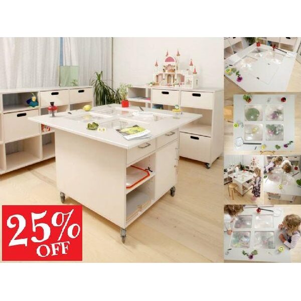 Bordet er et multifunktionelt møbel og kan bruges som forstørrelsesbord, legebord, spisebord, opbevaringsbord, beskæftigelsesbord mm.