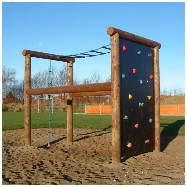 sjov forhindrings bane med klatrevæg og rebstige.