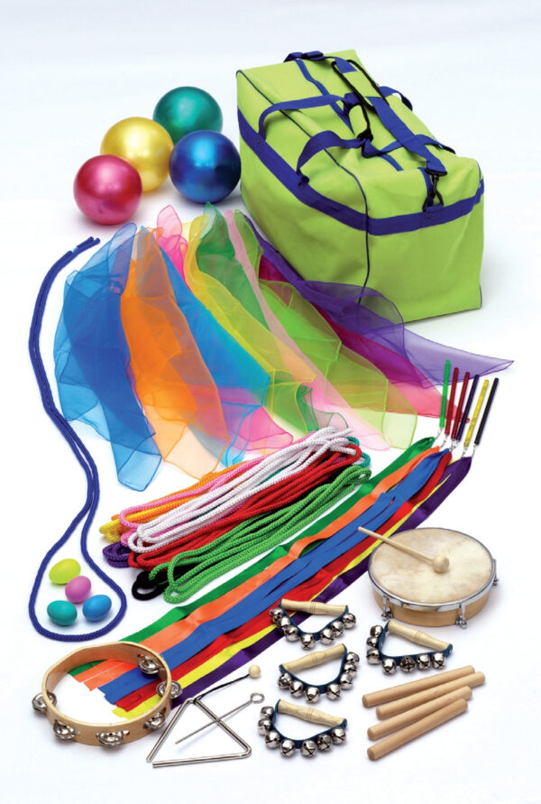 Sættet indeholder: 10 tørklæder, 10 sjippetove, 6 rytmebånd, 4 bolde, 2 par rytmestænger, 1 triangel, 1 tamburin uden skind,1 tamburin med skind og 4 rasle æg.